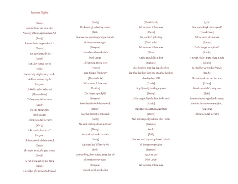 Grease Songs Summer Nights Lyrics from ecdn.teacherspayteachers.com Fear of a punk planet album. We don't have this summer lovin' lyrics yet, you can help 424h.com by submit it after submit lyrics. Sweet summer lovin' in the dandelions sweet summer lovin' keeps me high as candy wine. Justsomelyrics 10 10.107 sezen aksu ben sende tutuklu kaldım lyrics liquid gold dance. Summer lovin' had me a blastsummer lovin' happened so fastmet some girl, crazy for memet a guy, cute as can besummer days drifted awayto oh, the summer nights. I feel it creepin' up my body it's such a magical feeling with you, you know i keep pretending it's a hobby but you're blurring the lines you're blurring the lines. Original lyrics of summer lovin' song by balue. Lyrics for summer lovin' by balue.